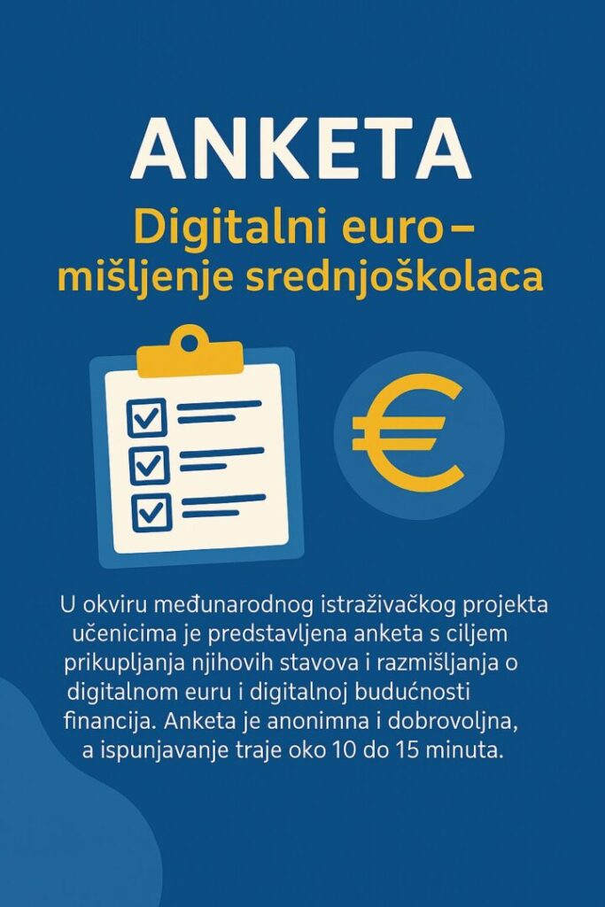 U okviru međunarodnog istraživačkog projekta učenicima je predstavljena anketa s ciljem prikupljanja njihovih stavova i razmišljanja o digitalnom euru i digitalnoj budućnosti financija. Anketa je anonimna i dobrovoljna, a ispunjavanje traje oko 10 do 15 minuta.