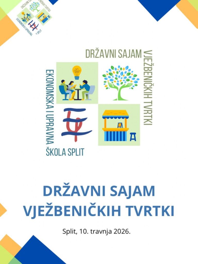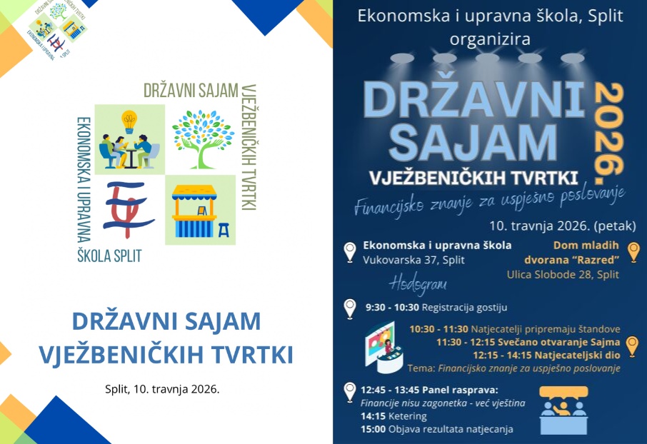 U organizaciji Ekonomske i upravne škole, Split, 10. travnja 2026. u Domu mladeži održan je Državni sajam vježbeničkih tvrtki iz cijele Hrvatske. Cjelodnevno događanje okupilo je učenike iz deset hrvatskih srednjih strukovnih škola ekonomskog usmjerenja koji su pod mentorstvom svojih nastavnika prezentirali tvrtke i proizvode razvijene u sklopu nastavnog predmeta Vježbenička tvrtka i predmeta struke tijekom srednjoškolskog strukovnog obrazovanja.