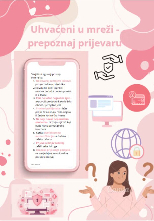Aktivnost je bila usmjerena na prepoznavanje financijskih prijevara i sigurnost na internetu. Kroz analizu stvarnih scenarija i simulacije situacija učenici su učili kako prepoznati rizične obrasce ponašanja, zaštititi osobne podatke te odgovorno koristiti digitalne alate. Razvijana je svijest o važnosti opreza u online okruženju. Učenici su sudjelovali u HANFA nagradnom natječaju na istoimenu temu.