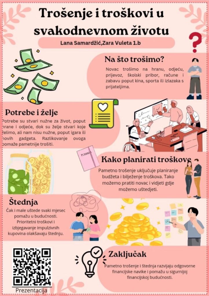 U okviru ove aktivnosti učenici su upoznati s osnovnim financijskim pojmovima i principima upravljanja novcem. Kroz praktične zadatke i primjere učili su o važnosti planiranja osobnog budžeta, racionalnog trošenja, štednje te osnovama investiranja. Aktivnost je pridonijela razvoju odgovornog financijskog ponašanja.