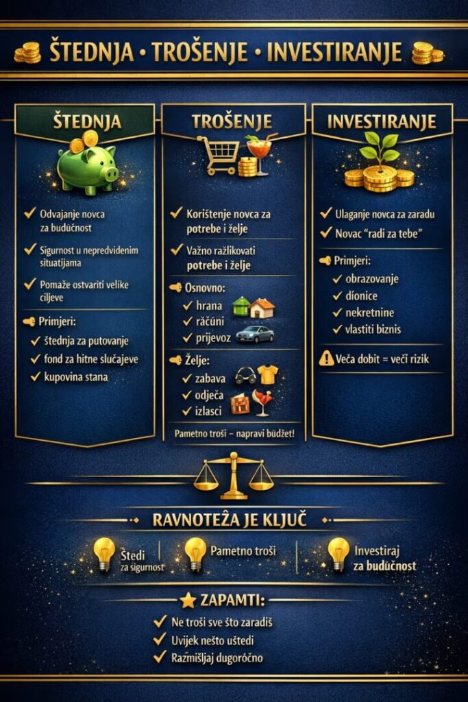 Ova aktivnost bila je usmjerena na analizu financijskog ponašanja kroz statističke podatke o štednji, trošenju, investiranju i odgovornoj potrošnji. Učenici su razvijali vještine interpretacije podataka, zaključivanja i donošenja financijskih odluka na temelju konkretnih primjera. Poseban naglasak stavljen je na razumijevanje dugoročnih posljedica financijskih izbora.