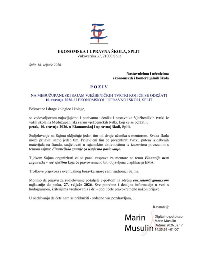 Poziv na međužupanijski sajam vježbeničkih tvrtki koji će se održati 10. travnja 2026. godine u Ekonomskoj i upravnoj školi, Split.
