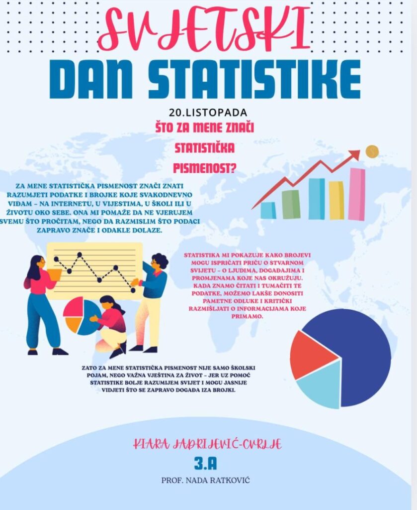 Prva aktivnost – Obilježavanje Europskog i svjetskog dana statistike – uspješno je provedena u listopadu 2025. i bila je uvod u cjelogodišnji projekt “Statistika i mi – kroz brojke do razumijevanja”, koji će se nastaviti nizom radionica, istraživanja i natjecanja tijekom školske godine.