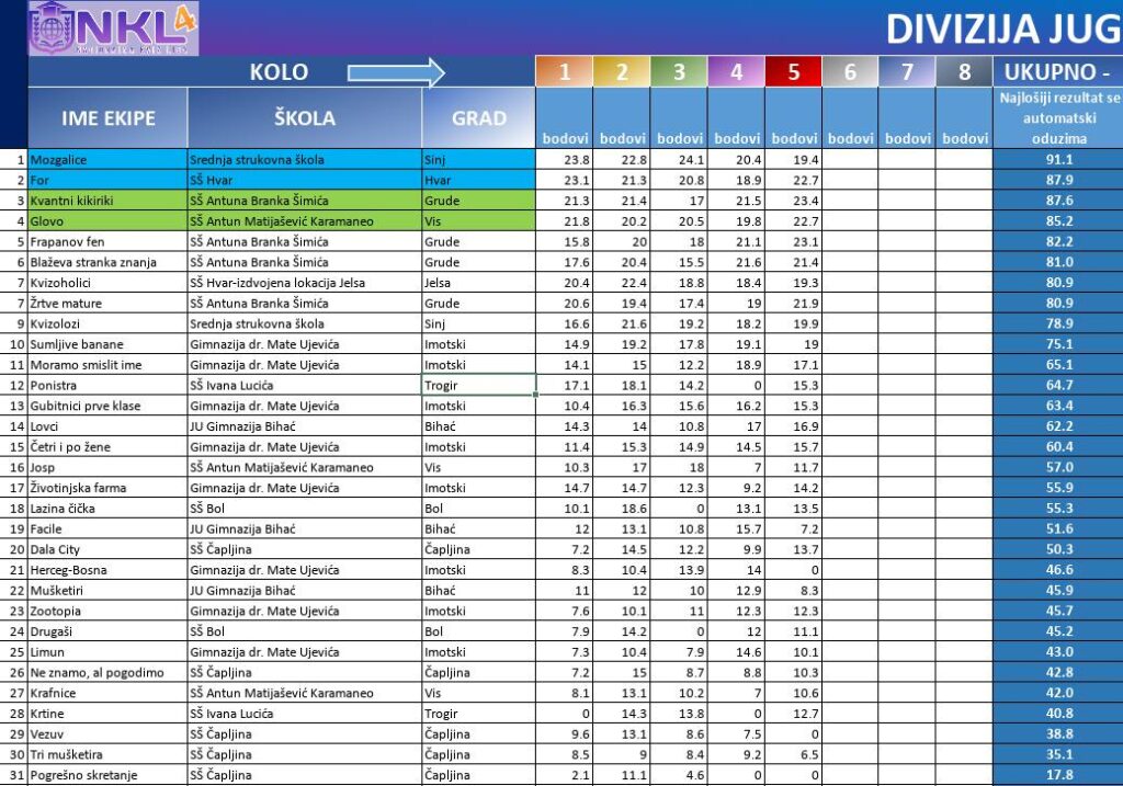 Naše dvije ekipe Mozgalice i Kvizolozi nakon nultog, 1. 2. 3. 4. i 5. kola nastavljaju briljirati. Obje ekipe su se plasirale u top 25 u nultom kolu . i prvih 9. u našoj diviziji JUG kola NKL 4 – sezone 25/26. i pokazale su izvrsno znanje, brzinu i pravi timski duh. I ove školske godine sudjeluje oko 250 ekipa iz cijele Hrvatske i Bosne i Hercegovine formirane u 10, divizija. Rezultati učenike dodatno motiviraju.