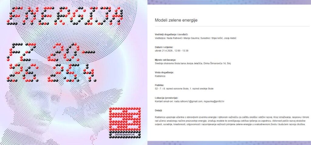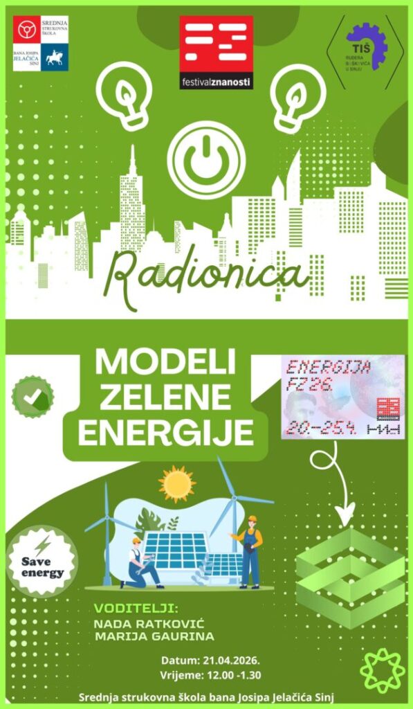 Povodom Festivala znanosti 2026 u sklopu planiranih aktivnosti Srednje strukovne škole bana Josipa Jelačića Sinj, proveden je edukacijski program pod nazivom Modeli zelene energije s ciljem jačanja kompetencija učenika u području obnovljivih izvora energije i održivog razvoja. Aktivnosti su bile usmjerene na unapređenje znanja učenika o obnovljivim izvorima energije, suvremenim tehnološkim trendovima te mogućnostima njihove primjene u lokalnoj zajednici. Program je obuhvatio teorijski i praktični dio te je učenicima omogućio razumijevanje aktualnih energetskih trendova i izazova.